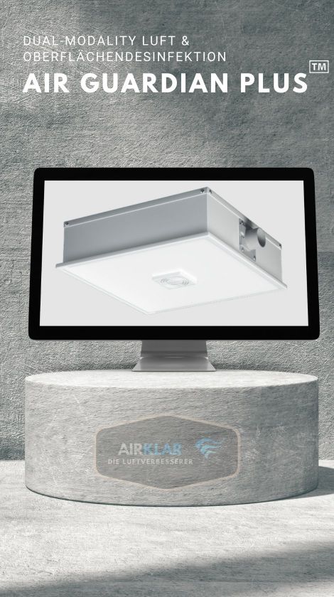 Als exklusiver Partner der IllumiPure Air Guardian ® Serie sorgt AirKlar für eine saubere und virenfreie Umgebung! Die innovative Kombination von Raumluftreiningung und UV Licht sorgt nicht nur für bessere Luftqualität, sondern desinfiziert gleichzeitig Ihre Oberflächen! Der Air Guardian+ tötet nachweislich mehr als 99% der Krankheitserreger an der Oberfläche und in der Luft ab. Sicher. Ständig. AirKlar.